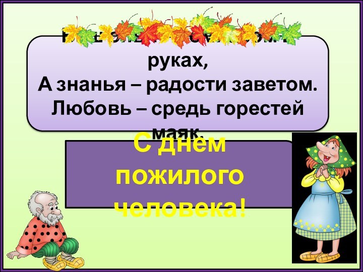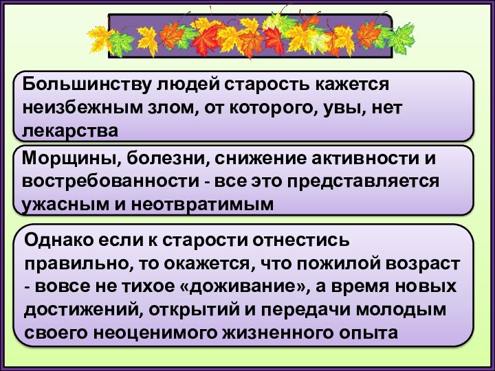 Однако если к старости отнестись правильно, то окажется, что пожилой возраст - вовсе не тихое «доживание», а время новых достижений, открытий и передачи молодым своего неоценимого жизненного опыта