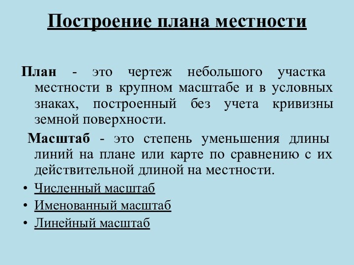 без учета кривизны земной поверхности.Масштаб - это степень уменьшения длины линий на плане или карте по сравнению с их действительной длиной на местности.