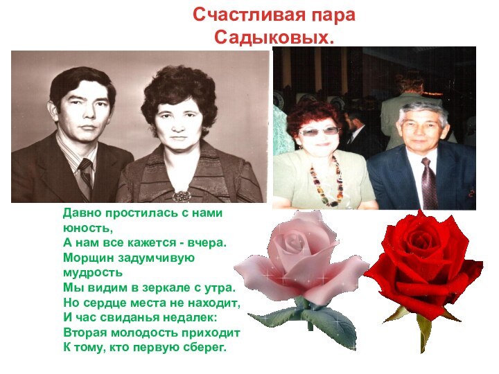 сердце места не находит, И час свиданья недалек: Вторая молодость приходит К тому, кто первую сберег.Счастливая пара Садыковых.