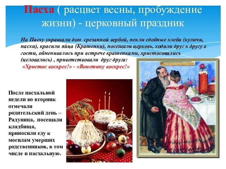 хлеба (куличи, пасхи), красили яйца (Крашенки), посещали церковь, ходили друг к другу в гости, обменивались при встрече крашенками, христосовались (целовались) , приветствовали друг друга: