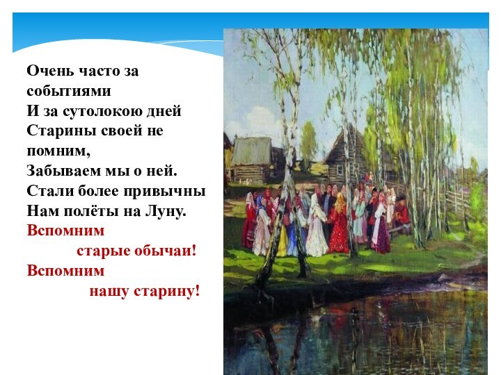 «Традиция», «обычай», «обряд» - важнейшие элементы культуры каждого народа , эти слова всем знакомы, вызывают в памяти определённые ассоциации и обычно бывают связаны с воспоминаниями о той, «ушедшей Руси». Неоценимая ценность традиций, обычаев и обрядов в том, что они свято хранят и воспроизводят духовный облик того или иного народа, его уникальные особенности, аккумулируя в себе весь накопленный культурный опыт многих поколений людей, привносят в нашу жизнь всё самое лучшее из духовного наследия народа. Благодаря традициям, обычаям и обрядам народы наиболее всего и отличается один от другого.