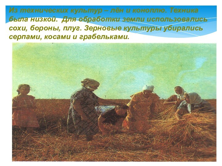 была низкой. Для обработки земли использовались сохи, бороны, плуг.
