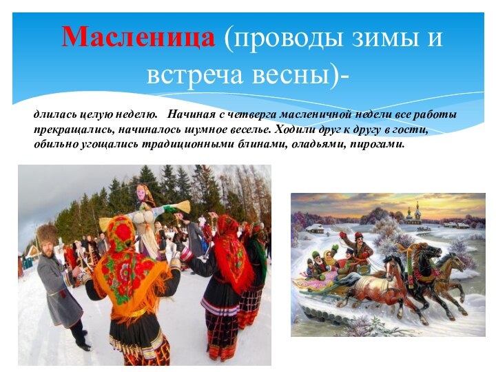 прекращались, начиналось шумное веселье. Ходили друг к другу в гости, обильно угощались традиционными блинами, оладьями, пирогами.