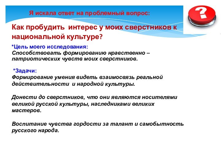 Донести до сверстников, что они являются носителями великой русской культуры, наследниками великих мастеров.