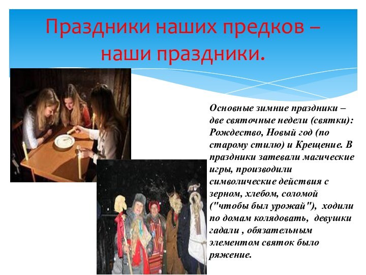 (по старому стилю) и Крещение. В праздники затевали магические игры, производили символические действия с зерном, хлебом, соломой ("чтобы был урожай"), ходили по домам колядовать, девушки гадали , обязательным элементом святок было ряжение.