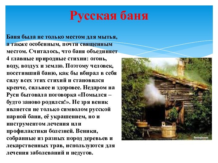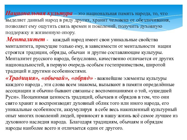 Менталитет - каждый народ имеет свои уникальные свойства менталитета, присущие только ему, в зависимости от ментальности нации строятся традиции, обряды, обычаи и другие составляющие культуры. Менталитет русского народа, безусловно, качественно отличается от других национальностей, в первую очередь особым гостеприимством, широтой традиций и другими особенностями.