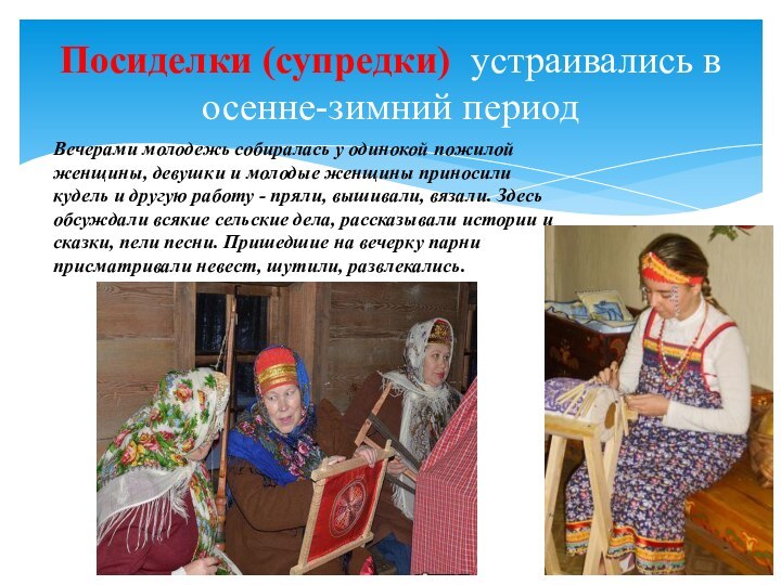 кудель и другую работу - пряли, вышивали, вязали. Здесь обсуждали всякие сельские дела, рассказывали истории и сказки, пели песни. Пришедшие на вечерку парни присматривали невест, шутили, развлекались.