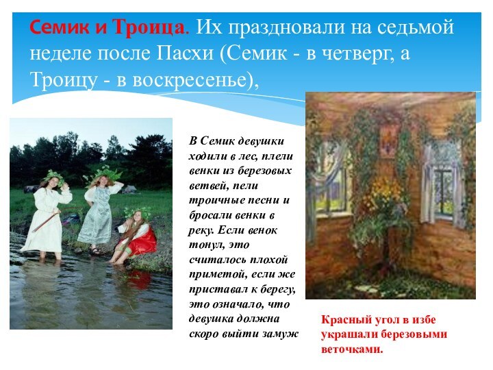 В Семик девушки ходили в лес, плели венки из березовых ветвей, пели троичные песни и бросали венки в реку. Если венок тонул, это считалось плохой приметой, если же приставал к берегу, это означало, что девушка должна скоро выйти замуж