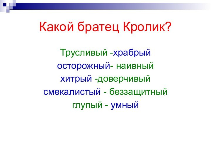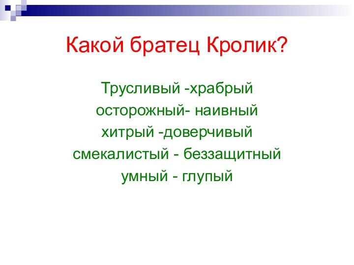 Какой братец Кролик?Трусливый -храбрыйосторожный- наивныйхитрый -доверчивыйсмекалистый - беззащитныйумный - глупый