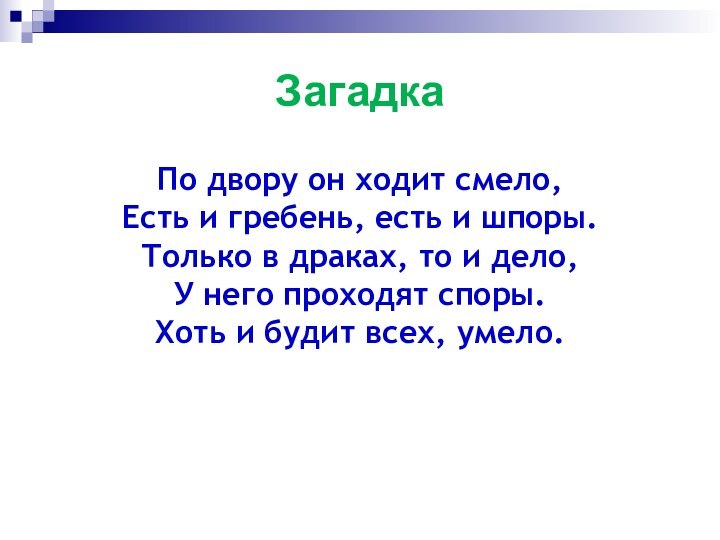 ЗагадкаПо двору он ходит смело, Есть и гребень, есть и шпоры.
