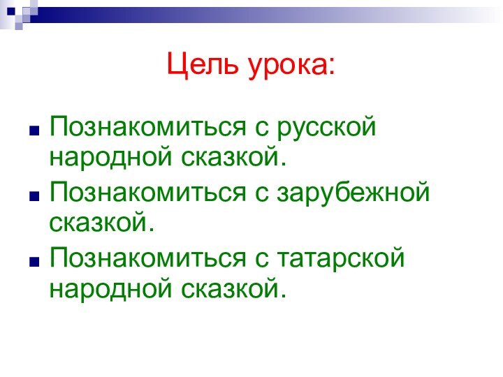 Цель урока:Познакомиться с русской народной сказкой.Познакомиться с зарубежной сказкой.Познакомиться с татарской народной сказкой.