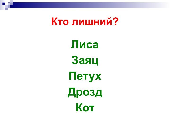 Кто лишний?ЛисаЗаяцПетухДроздКот