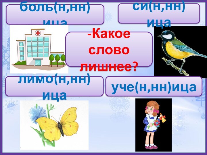 си(н,нн)ицалимо(н,нн)ицаболь(н,нн)ицауче(н,нн)ица-Какое слово лишнее?