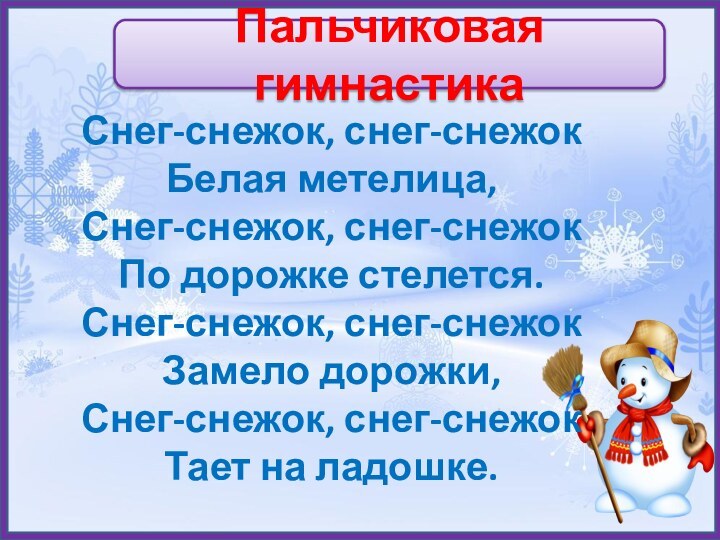 Пальчиковая гимнастикаСнег-снежок, снег-снежокБелая метелица,Снег-снежок, снег-снежокПо дорожке стелется.Снег-снежок, снег-снежокЗамело дорожки,Снег-снежок, снег-снежокТает на ладошке.