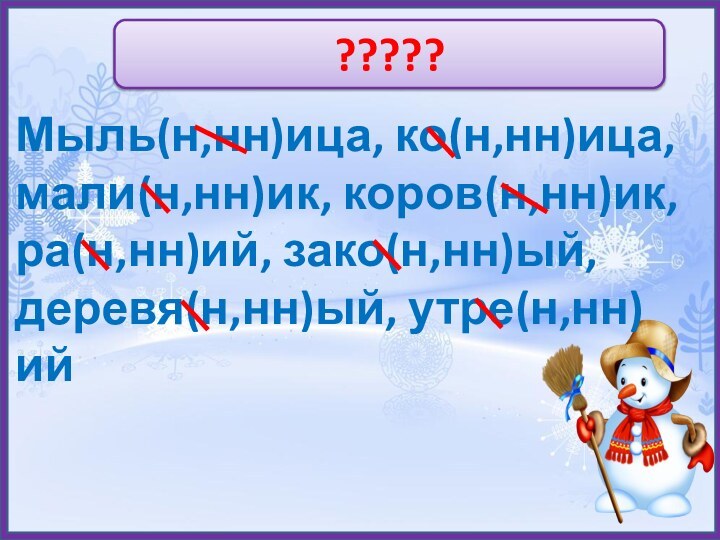 ?????Мыль(н,нн)ица, ко(н,нн)ица,мали(н,нн)ик, коров(н,нн)ик,ра(н,нн)ий, зако(н,нн)ый,деревя(н,нн)ый, утре(н,нн)ий