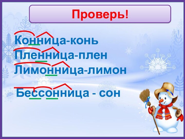 Проверь!Конница-коньПленница-пленЛимонница-лимонБессонница - сон
