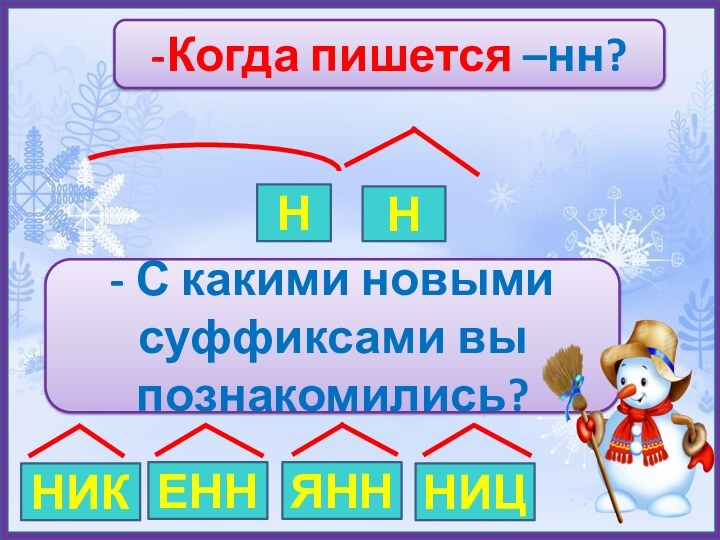 -Когда пишется –нн?НН- С какими новыми суффиксами вы познакомились?НИКЕННЯНННИЦ