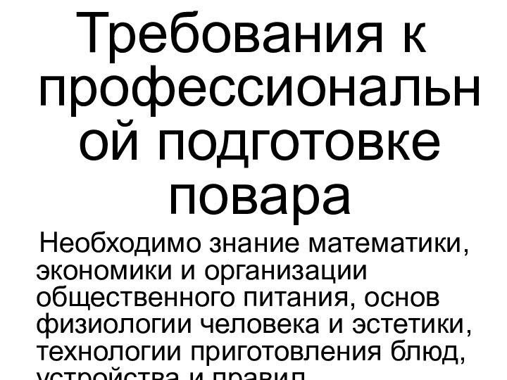 и эстетики, технологии приготовления блюд, устройства и правил эксплуатации специального оборудования. Знание норм и принципов современного права.