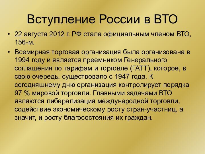 в 1994 году и является преемником Генерального соглашения по тарифам и торговле (ГАТТ), которое, в свою очередь, существовало с 1947 года. К сегодняшнему дню организация контролирует порядка 97 % мировой торговли. Главными задачами ВТО являются либерализация международной торговли, содействие экономическому росту стран-участниц, а значит, и росту благосостояния их граждан.