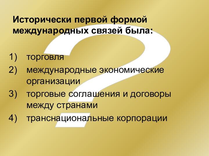 Исторически первой формой международных связей была:
