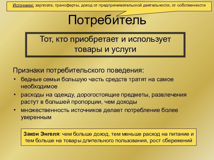 Потребление – заключительная стадия производства, в процессе которой произведенный продукт используется (потребление предметов длительного пользования) или уничтожается (потребление продовольствия).