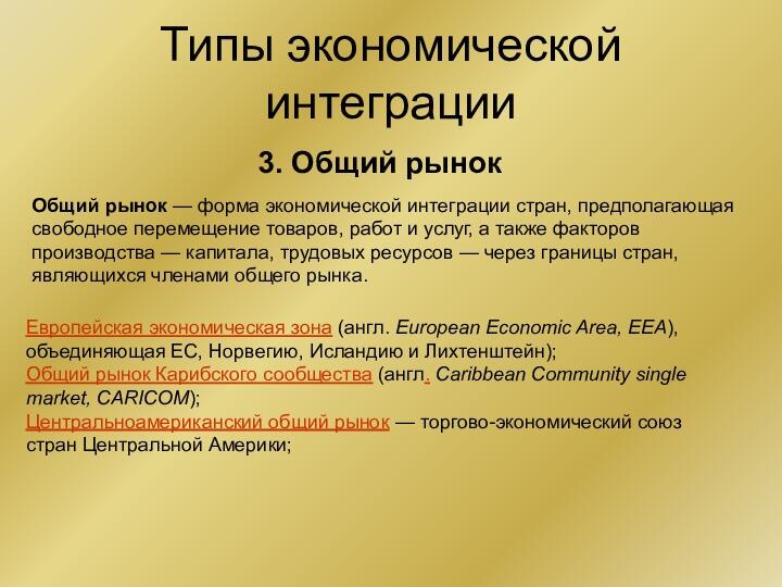 Общий рынок — форма экономической интеграции стран,