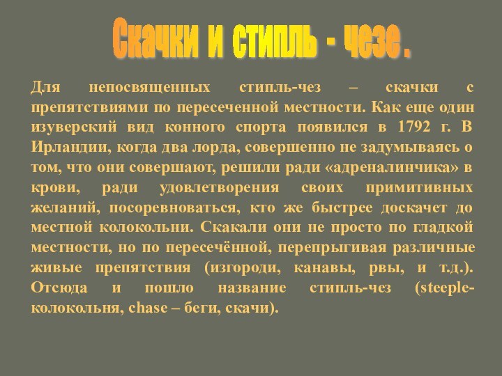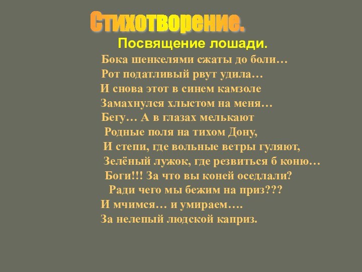 Бока шенкелями сжаты до боли… Рот податливый рвут удила… И снова этот в синем камзоле Замахнулся хлыстом на меня… Бегу… А в глазах мелькают Родные поля на тихом Дону, И степи, где вольные ветры гуляют, Зелёный лужок, где резвиться б коню… Боги!!! За что вы коней оседлали? Ради чего мы бежим на приз???