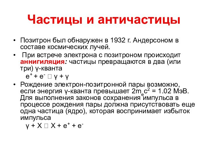 Рождение электрон-позитронной пары возможно, если энергия γ-кванта превышает 2mec2 = 1.02 МэВ. Для выполнения законов сохранения импульса в процессе рождения пары должна присутствовать еще одна частица (ядро), которая воспринимает избыток импульса