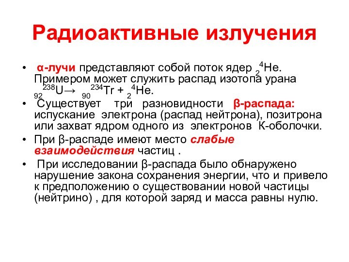 Примером может служить распад изотопа урана 92238U→ 90234Tr +
