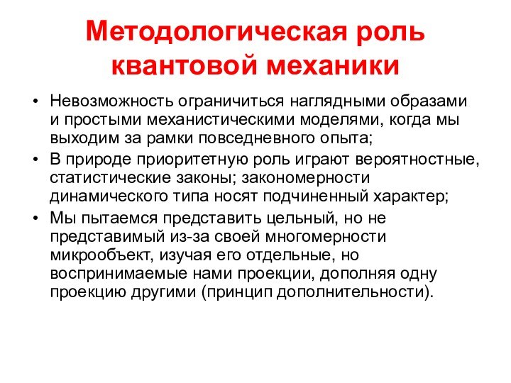 Мы пытаемся представить цельный, но не представимый из-за своей многомерности микрообъект, изучая его отдельные, но воспринимаемые нами проекции, дополняя одну проекцию другими (принцип дополнительности).