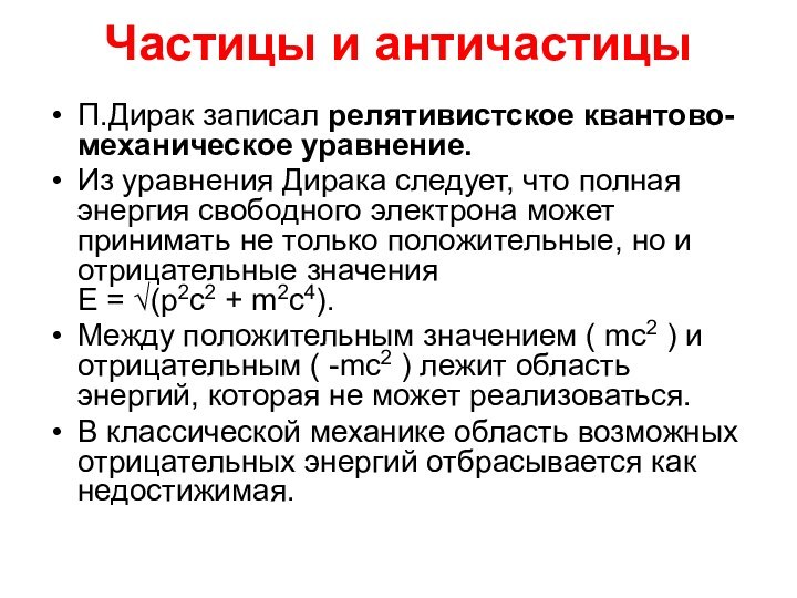 Между положительным значением ( mc2 ) и отрицательным ( -mc2 ) лежит область энергий, которая не может реализоваться.