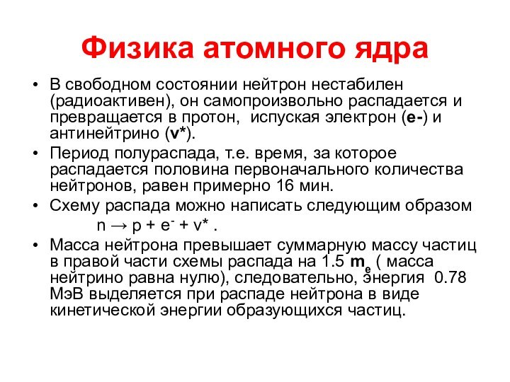 Масса нейтрона превышает суммарную массу частиц в правой части схемы распада на 1.5 mе ( масса нейтрино равна нулю), следовательно, энергия 0.78 МэВ выделяется при распаде нейтрона в виде кинетической энергии образующихся частиц.