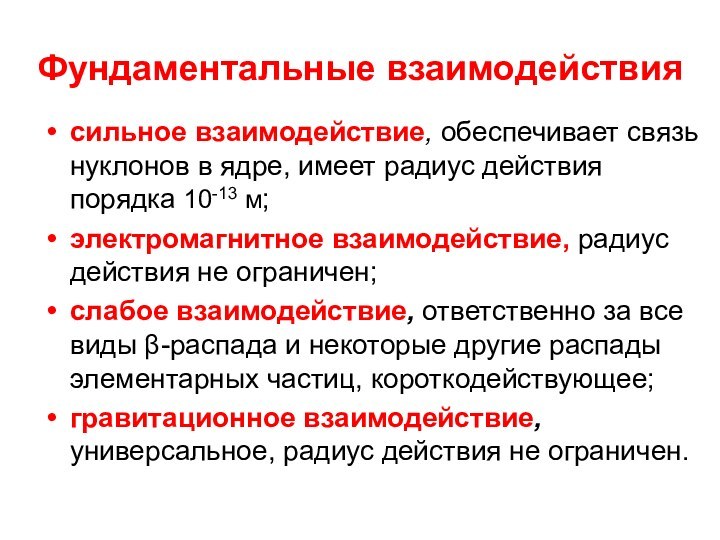слабое взаимодействие, ответственно за все виды β-распада и некоторые другие распады элементарных частиц, короткодействующее;