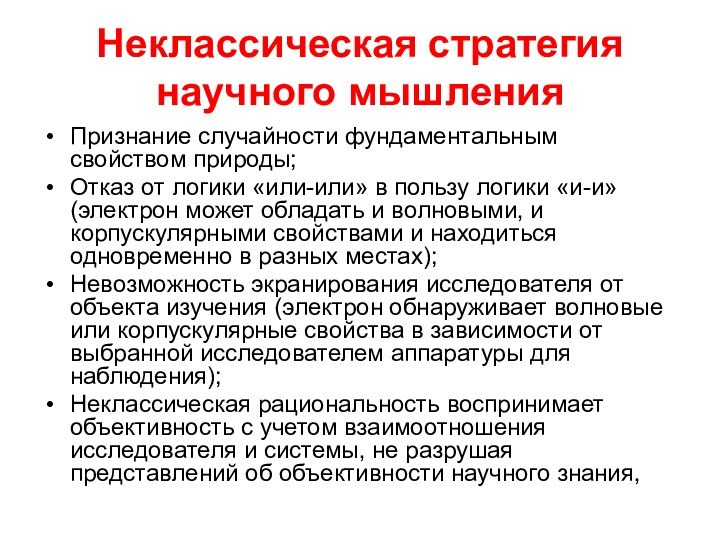 Неклассическая рациональность воспринимает объективность с учетом взаимоотношения исследователя и системы, не разрушая представлений об объективности научного знания,