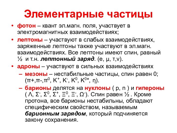 барионы делятся на нуклоны ( р, n ) и гипероны ( Λ, Σ-, Σ0, Σ+, Ξ0, Ξ-, Ω-). Спин равен ½ . Кроме протона, все барионы нестабильны, обладают специфическим свойством, называемым барионным зарядом, который подчиняется закону сохранения.