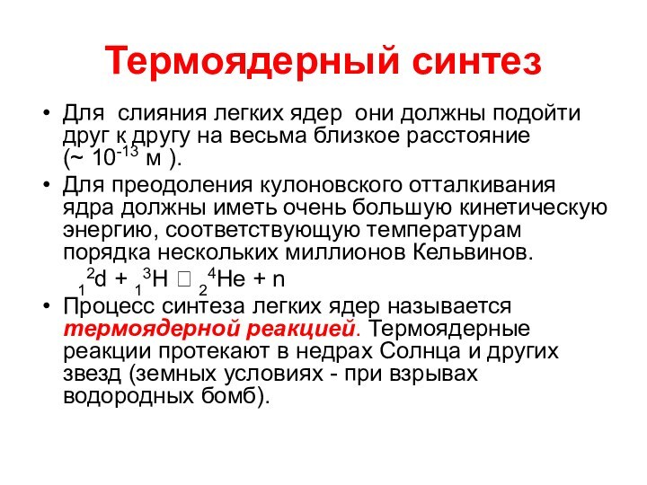 Процесс синтеза легких ядер называется термоядерной реакцией. Термоядерные реакции протекают в недрах Солнца и других звезд (земных условиях - при взрывах водородных бомб).