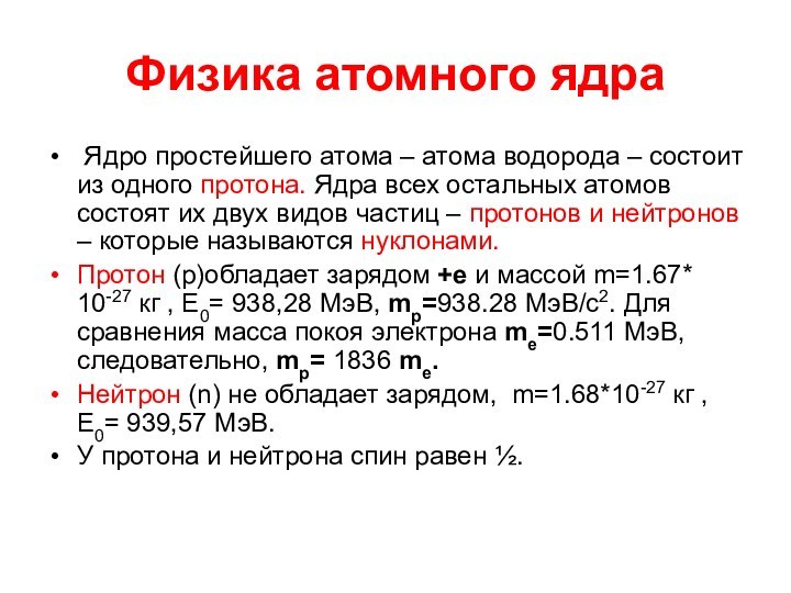 10-27 кг , Е0= 938,28 МэВ, mp=938.28 МэВ/с2. Для сравнения масса покоя электрона mе=0.511 МэВ, следовательно, mp= 1836 mе.