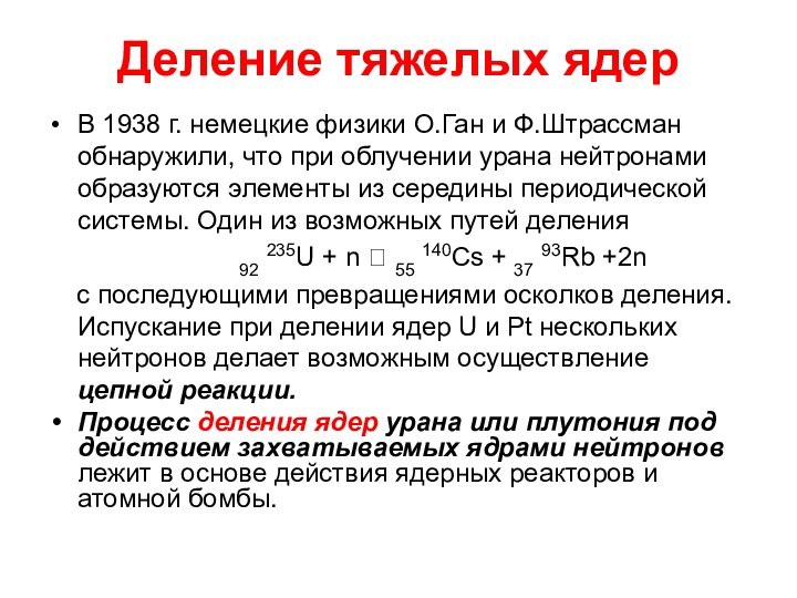 Процесс деления ядер урана или плутония под действием захватываемых ядрами нейтронов лежит в основе действия ядерных реакторов и атомной бомбы.