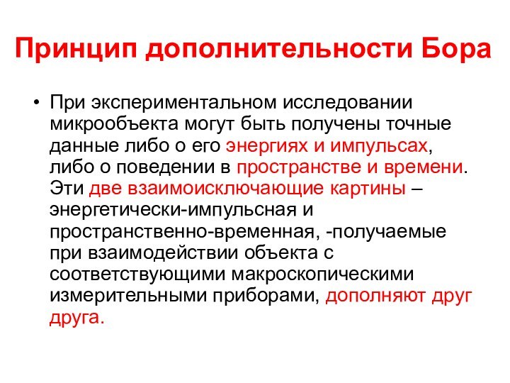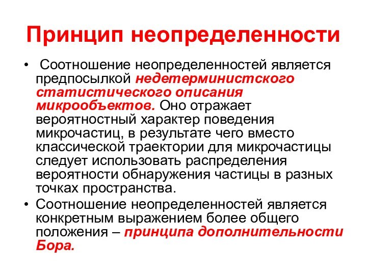 Соотношение неопределенностей является конкретным выражением более общего положения – принципа дополнительности Бора.
