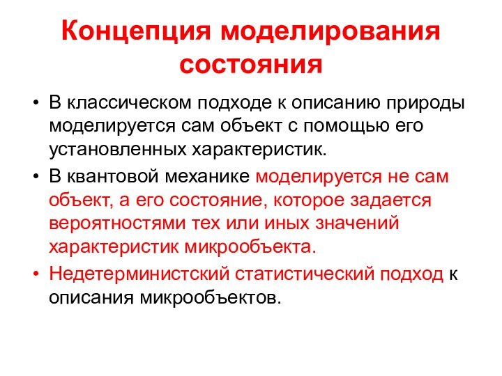 квантовой механике моделируется не сам объект, а его состояние, которое задается вероятностями тех или иных значений характеристик микрообъекта.