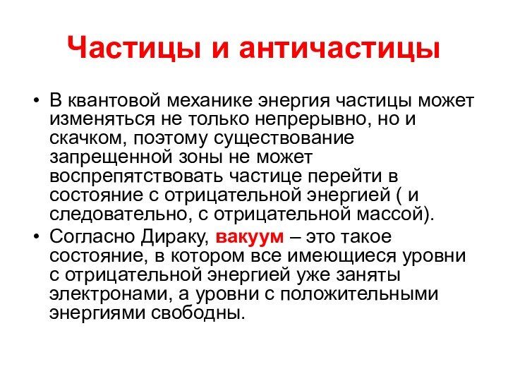 Согласно Дираку, вакуум – это такое состояние, в котором все имеющиеся уровни с отрицательной энергией уже заняты электронами, а уровни с положительными энергиями свободны.