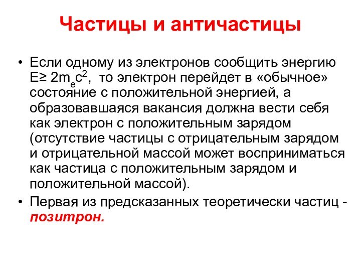 положительной энергией, а образовавшаяся вакансия должна вести себя как электрон с положительным зарядом (отсутствие частицы с отрицательным зарядом и отрицательной массой может восприниматься как частица с положительным зарядом и положительной массой).