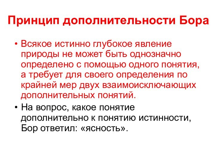 На вопрос, какое понятие дополнительно к понятию истинности, Бор ответил: «ясность».