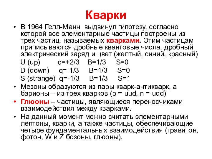 В 1964 Гелл-Манн выдвинул гипотезу, согласно которой все
