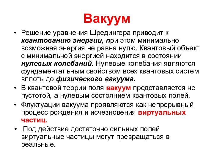 В квантовой теории поля вакуум представляется не пустотой, а нулевым состоянием квантовых полей.