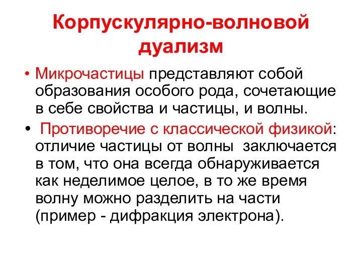классической физикой: отличие частицы от волны заключается в том, что она всегда обнаруживается как неделимое целое, в то же время волну можно разделить на части (пример - дифракция электрона).