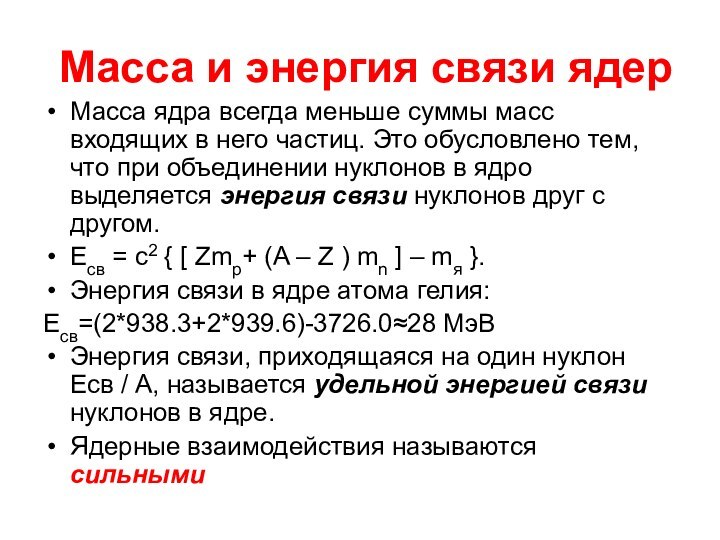 обусловлено тем, что при объединении нуклонов в ядро выделяется энергия связи нуклонов друг с другом.