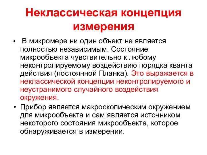 любому неконтролируемому воздействию порядка кванта действия (постоянной Планка). Это выражается в неклассической концепции неконтролируемого и неустранимого случайного воздействия окружения.