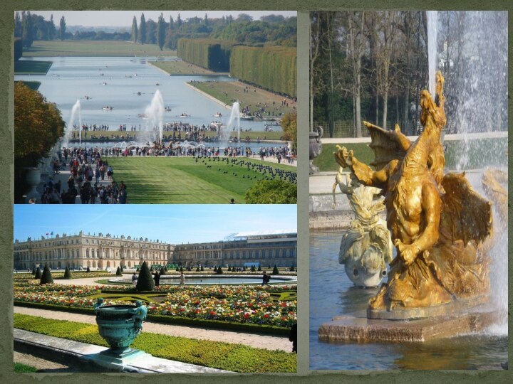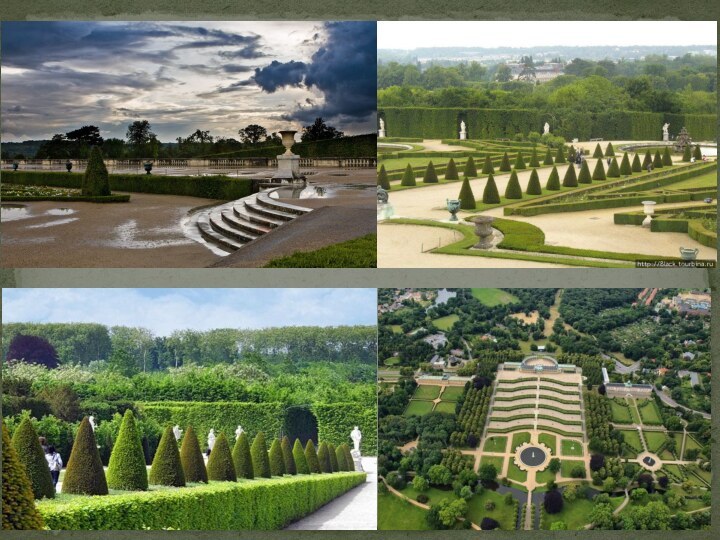 для яких було споруджено мисливський будиночок (1624). Згодом на вимогу Людовіка ХІІІ архітектор Жак Лемерсьє побудував тут невеликий палац. 1669 року Андре Ленотр (1613-1700), син головного садівника Тюїльрі за часів Луї ХІІІ розпочав будівництво парку Версаля, а згодом розробив принципи планування так званих французьких регулярних парків. Версаль – один із найбільших та видатніших парків Європи. Це – безліч терас, клумби, газони, оранжерея, алеї, майданчики з альтанками, басейни, фонтани, численні скульптури.