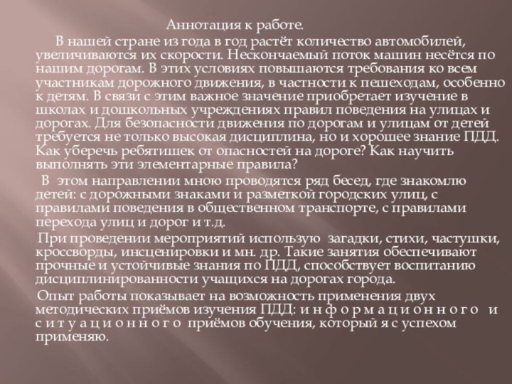 Аннотация к работе. В нашей стране из года в год растёт количество автомобилей, увеличиваются их скорости. Нескончаемый поток машин несётся по нашим дорогам. В этих условиях повышаются требования ко всем участникам дорожного движения, в частности к пешеходам, особенно к детям. В связи с этим важное значение приобретает изучение в школах и дошкольных учреждениях правил поведения на улицах и дорогах. Для безопасности движения по дорогам и улицам от детей требуется не только высокая дисциплина, но и хорошее знание ПДД. Как уберечь ребятишек от опасностей на дороге? Как научить выполнять эти элементарные правила? В этом направлении мною проводятся ряд бесед, где знакомлю детей: с дорожными знаками и разметкой городских улиц, с правилами поведения в общественном транспорте, с правилами перехода улиц и дорог и т.д. При проведении мероприятий использую загадки, стихи, частушки, кроссворды, инсценировки и мн. др. Такие занятия обеспечивают прочные и устойчивые знания по ПДД, способствует воспитанию дисциплинированности учащихся на дорогах города. Опыт работы показывает на возможность применения двух методических приёмов изучения ПДД: и н ф о р м а ц и о н н о г о и с и т у а ц и о н н о г о приёмов обучения, который я с успехом применяю.